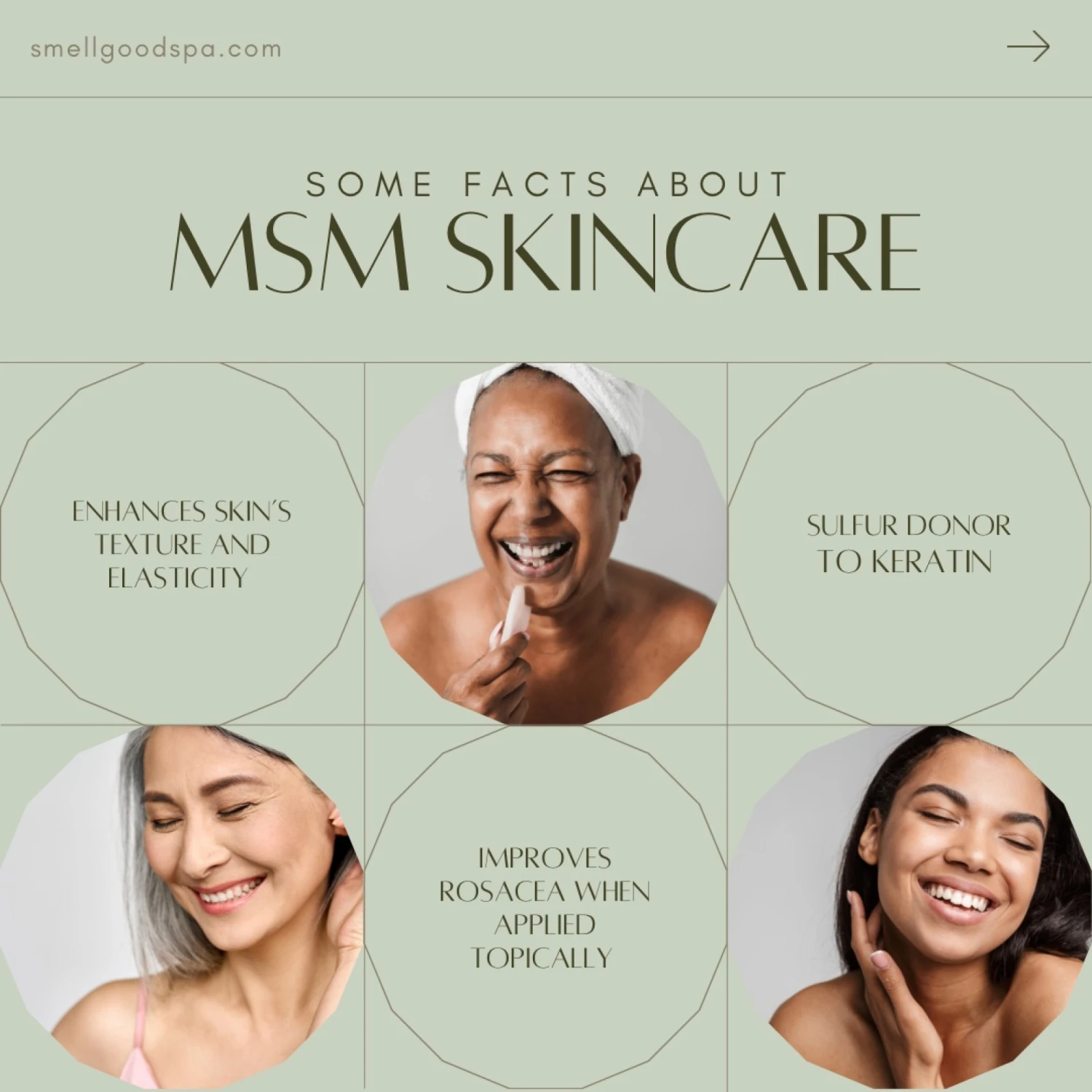 - MSM– Plumps skin. Supports keratin. Boosts collagen. (the main structural protein in skin is keratin. Keratin contains high levels of the sulfur-containing amino acid cysteine. Therefore, MSM may be beneficial for skin health by acting as a sulfur donor to keratin, which can help strengthen the important protein.)